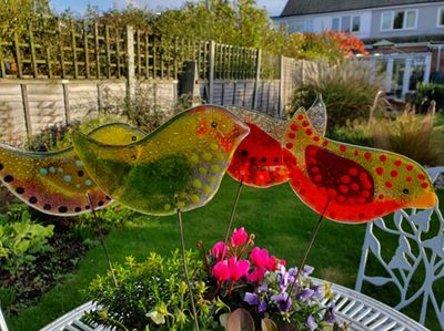You will be cutting and making up to 3 colourful birds that can stand alone in the garden or grouped together in a wooden stand ( not provided).